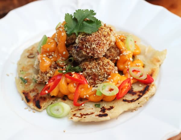 Remove the Popcorn chicken from the oven and stack over the pancake, drizzle over Sriracha Mayonnaise and sprinkle over some toasted sesame seeds, spring onion, coriander and freshly sliced chillies and eat immediately.