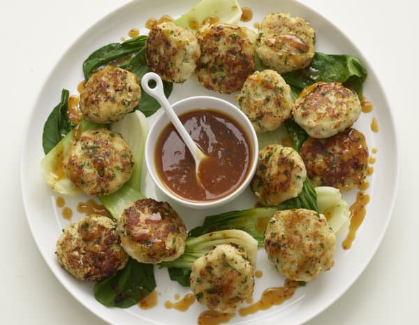 Serve on blanched leaves with remainder of dressing to dip the fishcakes in.
