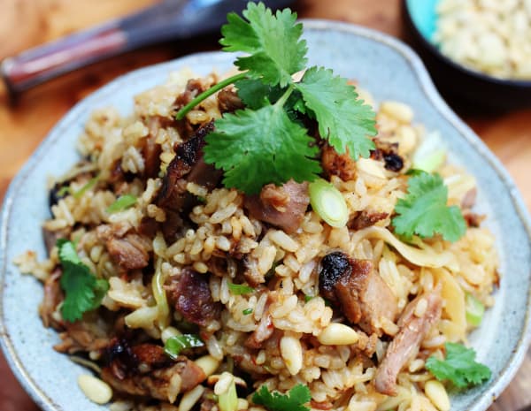 Heat a wok over high heat, add the rapeseed oil, add the chill, minced garlic, spring onion and wok fry for a few seconds, then add the white cabbage, toss cooking for half a minute until wilted. Add the Shaoxing rice wine. Add the cooked Sushi rice and then follow with the shredded duck. Add the Oyster Sauce, Double Deluxe Soy Sauce and toss cooking until all the ingredients are combined well. Season with pure sesame oil, ground white pepper and fresh spring onion. Serve immediately.
