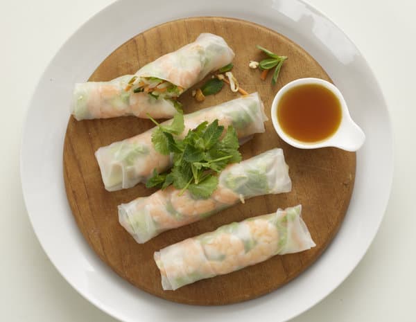 Half fill a frying pan with cold water. Dunk a rice wrapper in and keep patting for 1½minutes until it is pliable, but not too soft. Remove and lay flat. Arrange the filling towards one end of the wrapper. Roll up squeezing out the air as you go.